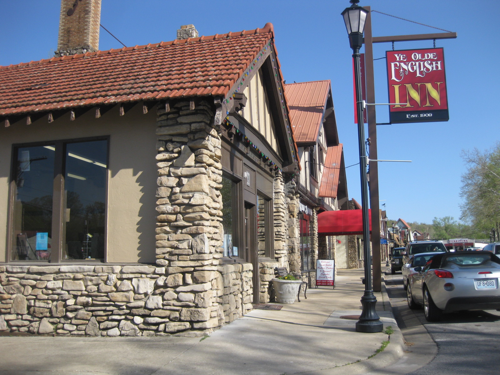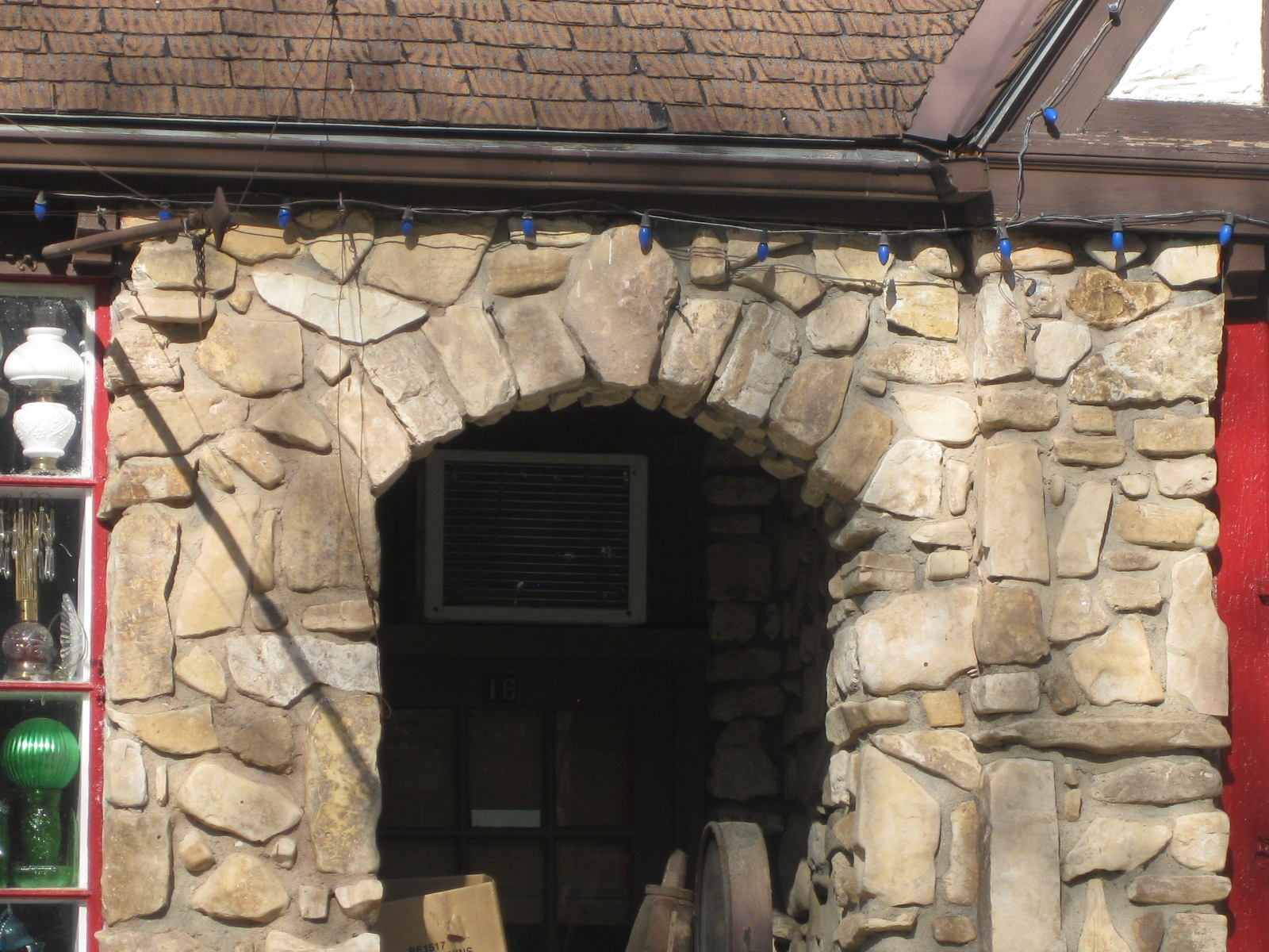 Grandpa’s first building in stone, commercial buildings in Hollister, including the The English Inn, was in limestone, the material of his traditional foundation and fireplace craft. His technique at first is obvious. With sledge and rock hammers, he pounded blocks into rough geometric shapes and laid them with little cement into rough forms. He mad his first crude arched doorways. By the time he moved to the ground floor interior of The English Inn, he had begun to develop a finer technique in cutting and laying the stone, but he was still pounding limestone with rock hammer and sledge into building blocks which he made into heavy block-shaped walls, relieved only by cavelike arched casements as heavy as the walls. But the ground floor had to be stone, because the developers had laid their town where no hill native would have built–in a creek bottom where it was subject to annual flooding. Above the ground floor, in second and third and fourth floors and attics, Grandpa turned to his traditional medium, wood, but the size and purpose of the building placed the building far outside the traditional craft. Accroding to order, he built exposed, mortised and tenoned oak beams framing stuccoed masonry, all topped by steep, many-gabled roofs–an Elizabethan fantasy in the turn-of-the-century Ozarks.