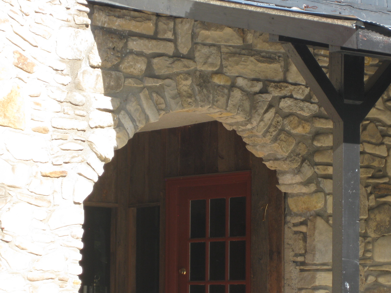 First step in building an arched stone entryway was to tear out the plywood and framing [which had covered a crudely-built entry]. Stone were broken with a sledgehammer then chipped out on either side to provide anchoring ledges for the arch. Recycled reinforcing rod is bent to shape in the blacksmith shop. Two bars are bent then short lengths are welded between. The arch frame is propped in place and stones laid up from either end. The frame must stay in place until the keystone is set and the mortar hardens partially. Then the rest of the stone can be laid. The completed arch of creekbed limestone blends with the older stonework.